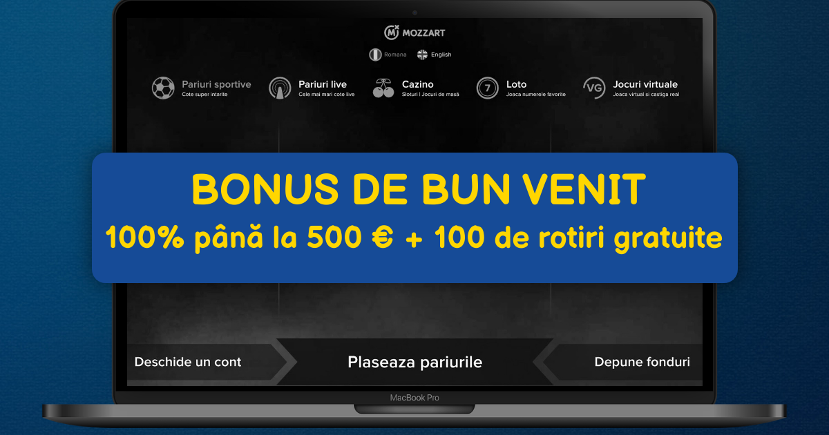 Bonusul de bun venit se acordă noilor jucători după prima depunere. Promoția constă într-un bonus de 100% până la 4.500 RON și 150 de rotiri gratuite la jocul Mozzart Joker de la Endorphina, fără condiții de rulaj pentru rotiri. Depunerea minimă necesară pentru activare este de 50 RON, iar pentru bonus trebuie utilizat codul promoțional 100MOZ. Câștigurile din rotirile gratuite pot fi retrase imediat, cu limita maximă de 500 RON, în timp ce bonusul de bani reali necesită rulaj de 40 de ori suma depusă plus bonusul pentru retragere. Retragerea maximă din bonus este întotdeauna limitată la 5 ori valoarea acestuia.